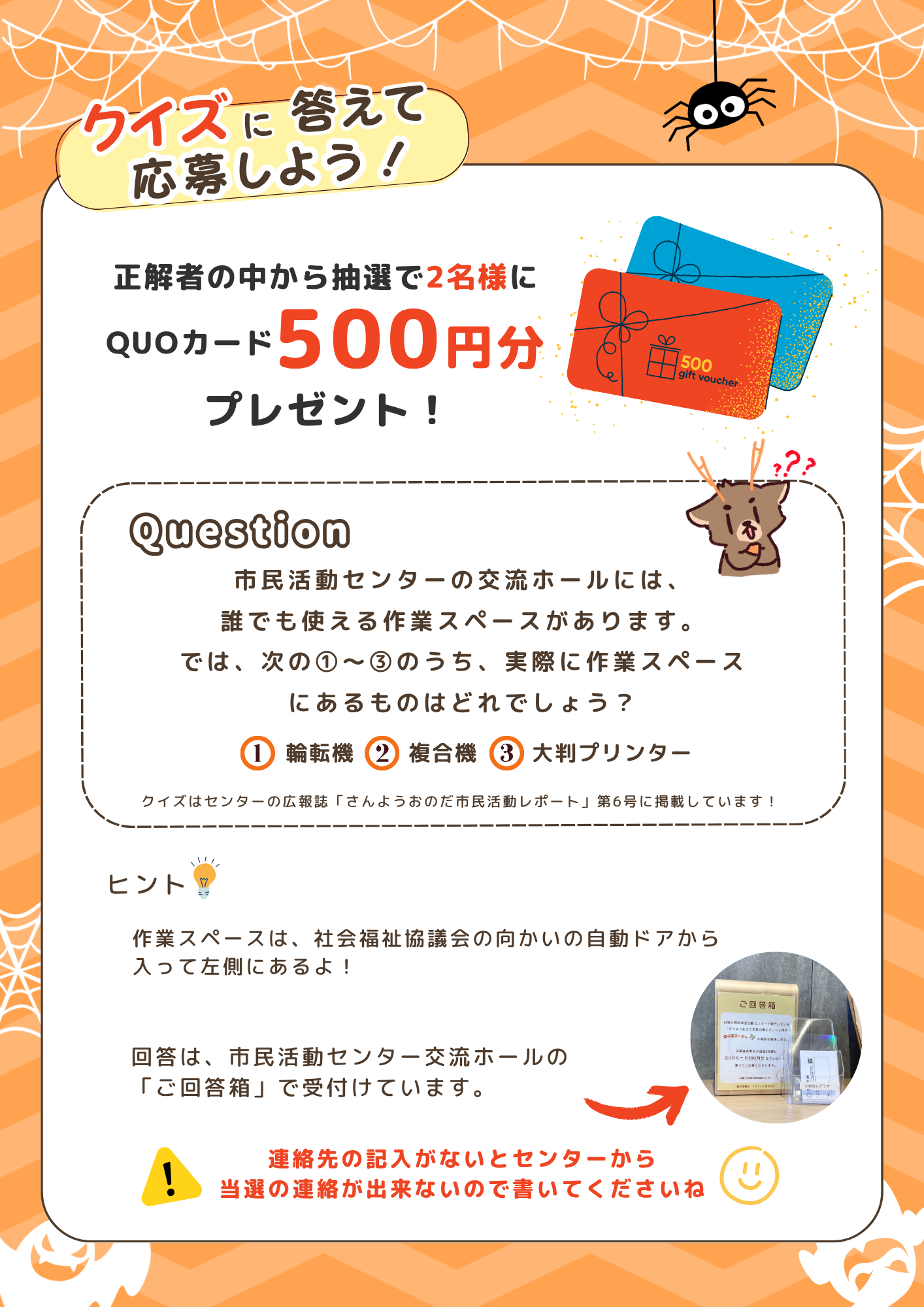 クイズの答えは交流ホールのご回答箱で受付中! 正解者の中から抽選で2名様にQUOカード500円分をプレゼントしますので、 奮ってご応募ください😊