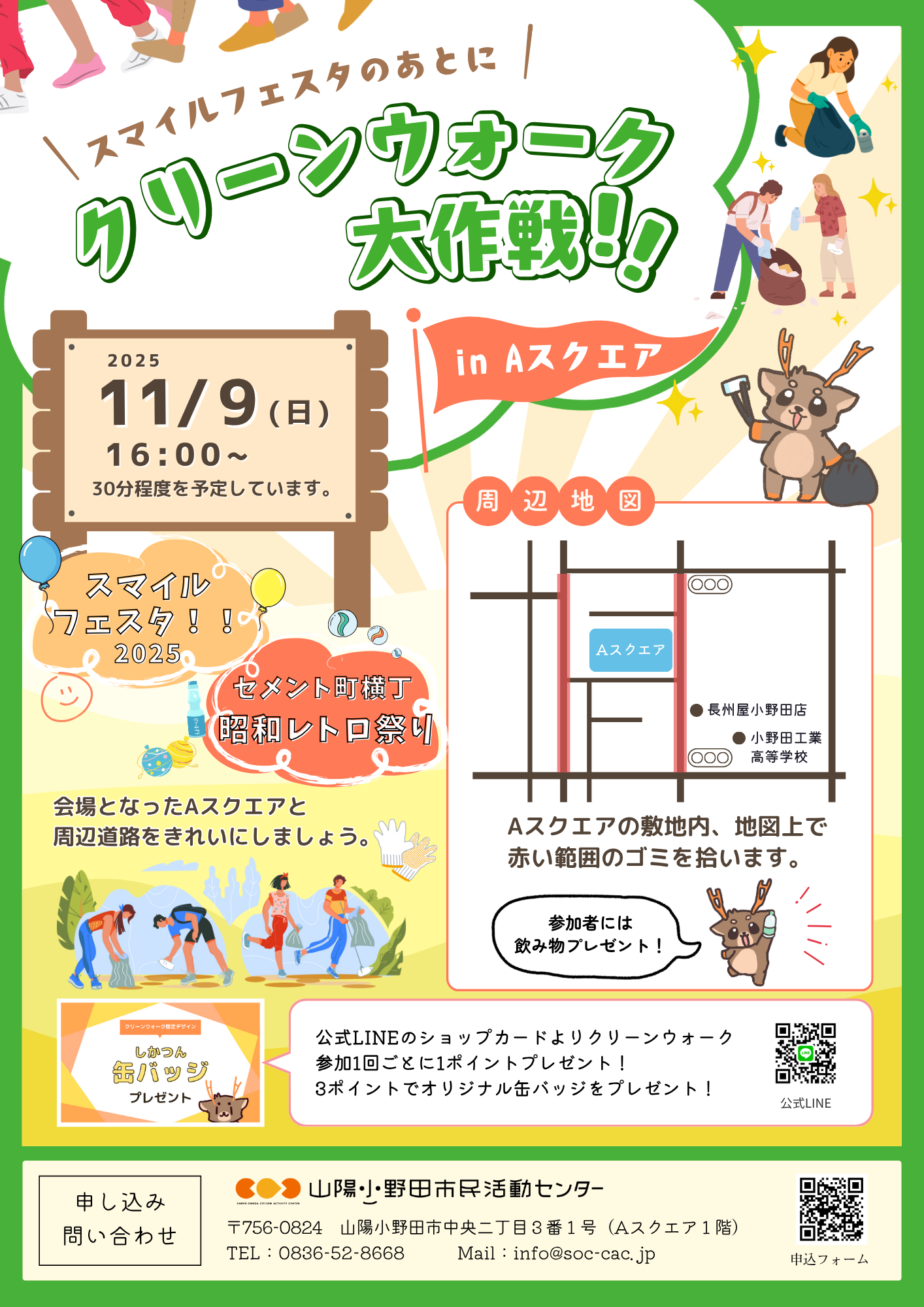 「スマイルフェスタ!!2025」、「セメント町横丁 昭和レトロ祭り」終了後に、会場となったAスクエアと周辺道路をキレイにします!