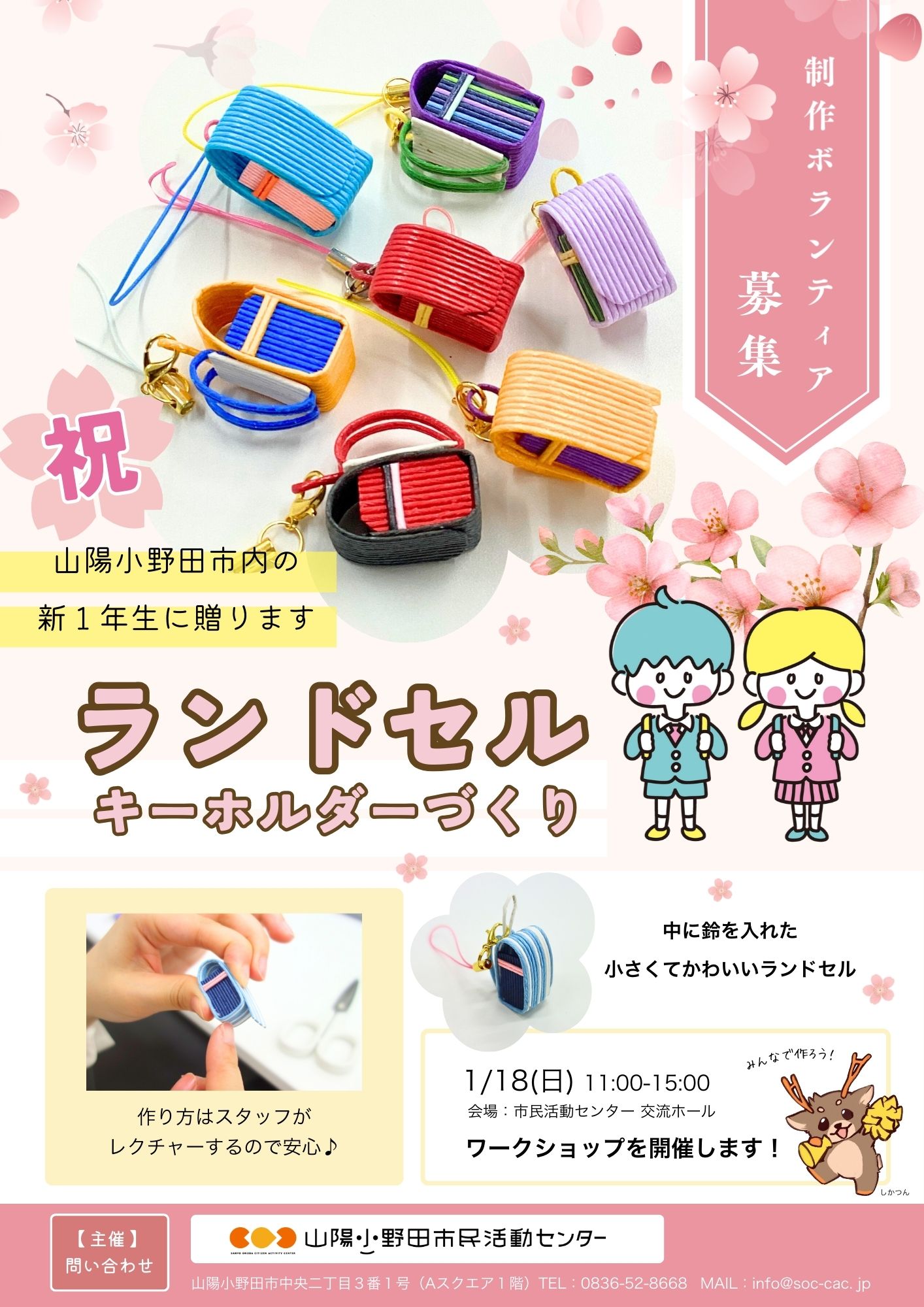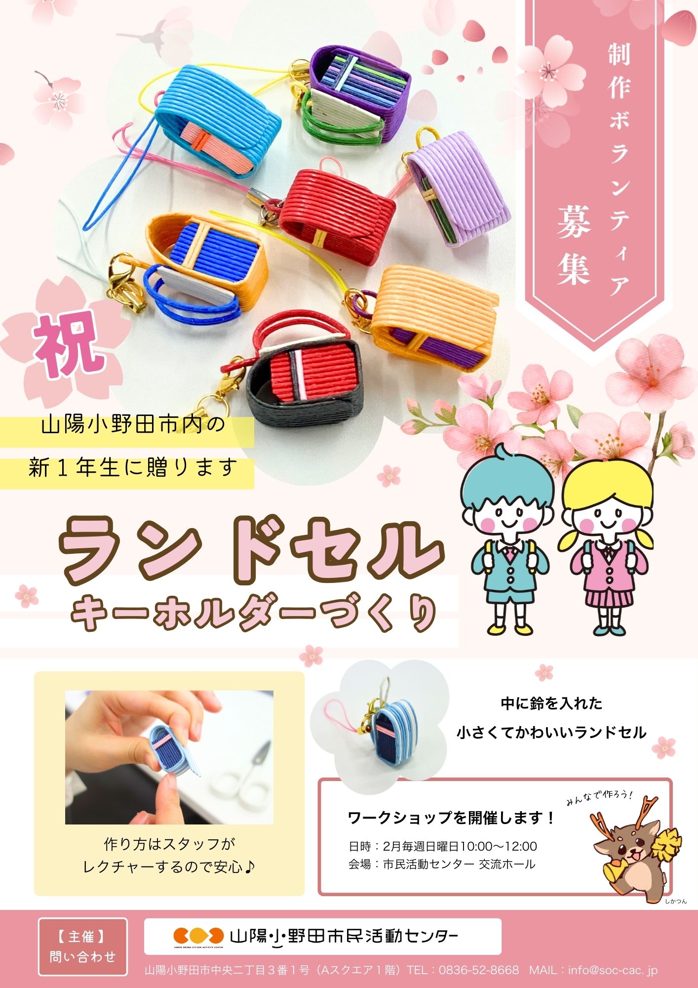 地域の子どもたちを応援する取り組みとして、クラフトバンドで作ったランドセルキーホルダーを、山陽小野田市内の新小学1年生に贈ります。