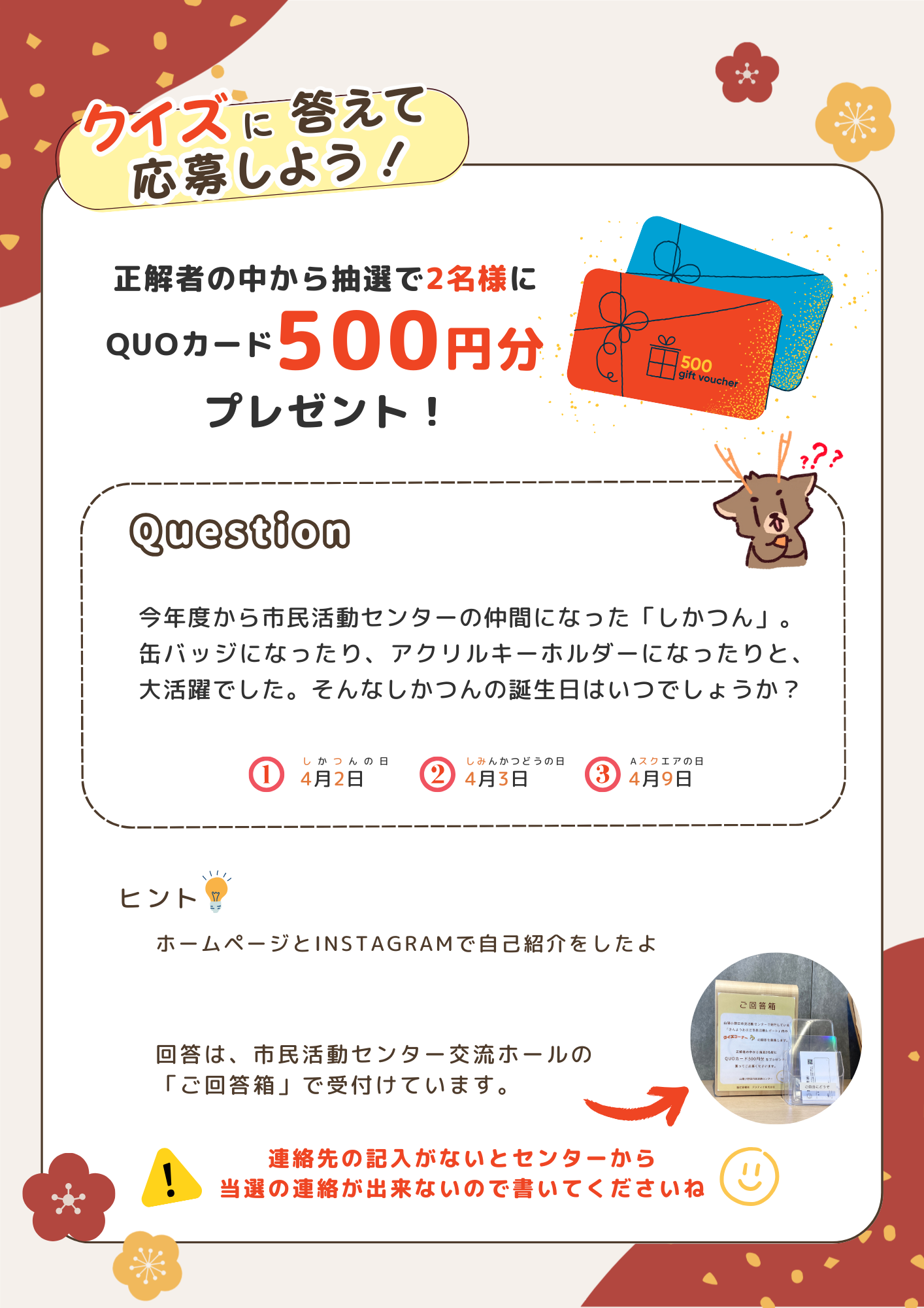 クイズの答えは交流ホールのご回答箱で受付中! 正解者の中から抽選で2名様にQUOカード500円分をプレゼントしますので、 奮ってご応募ください😊