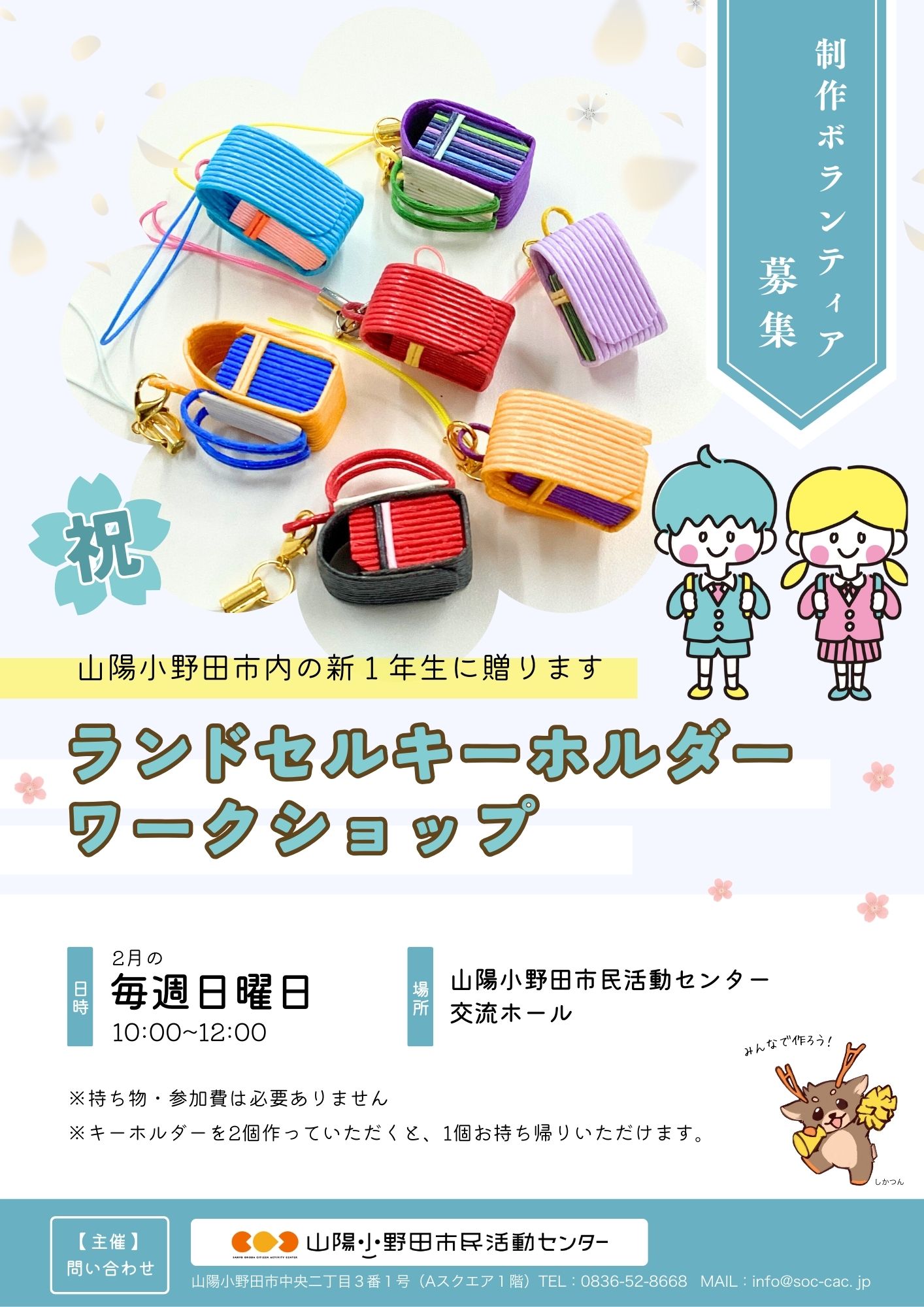 地域の子どもたちを応援する取り組みとして、山陽小野田市内の新小学1年生に、ランドセルキーホルダーを贈ります。市民活動センターでは、1月より多くのボランティアの皆さまにご協力いただき、キーホルダーの制作を行ってきました。