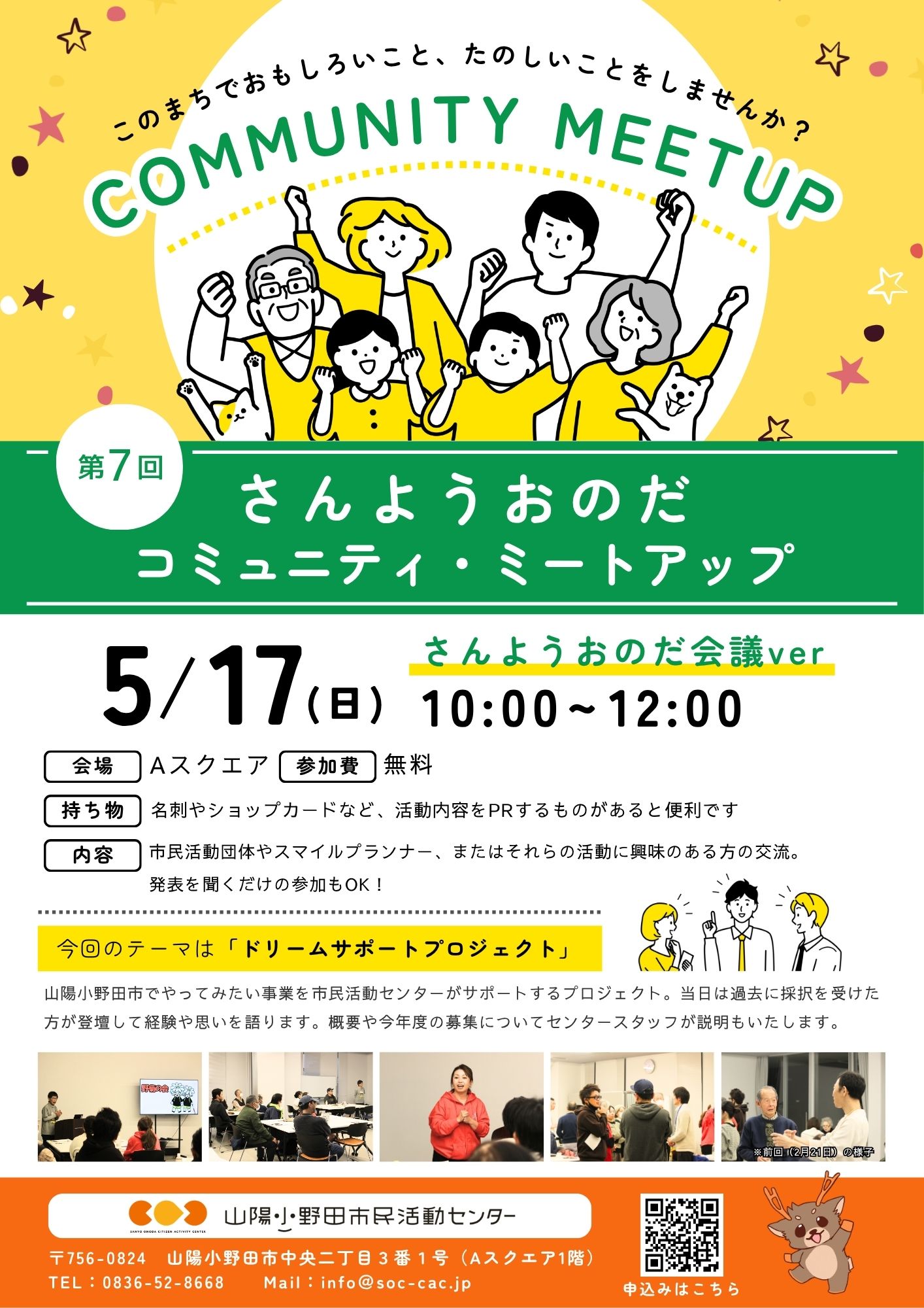 第7回となる今回は、山陽小野田市でまちづくりに取り組んでいる方々のお話を伺うほか、市民活動団体が山陽小野田市でやってみたい事業を、センターがサポートする「ドリームサポートプロジェクト」の2026年度募集についての説明を行います。