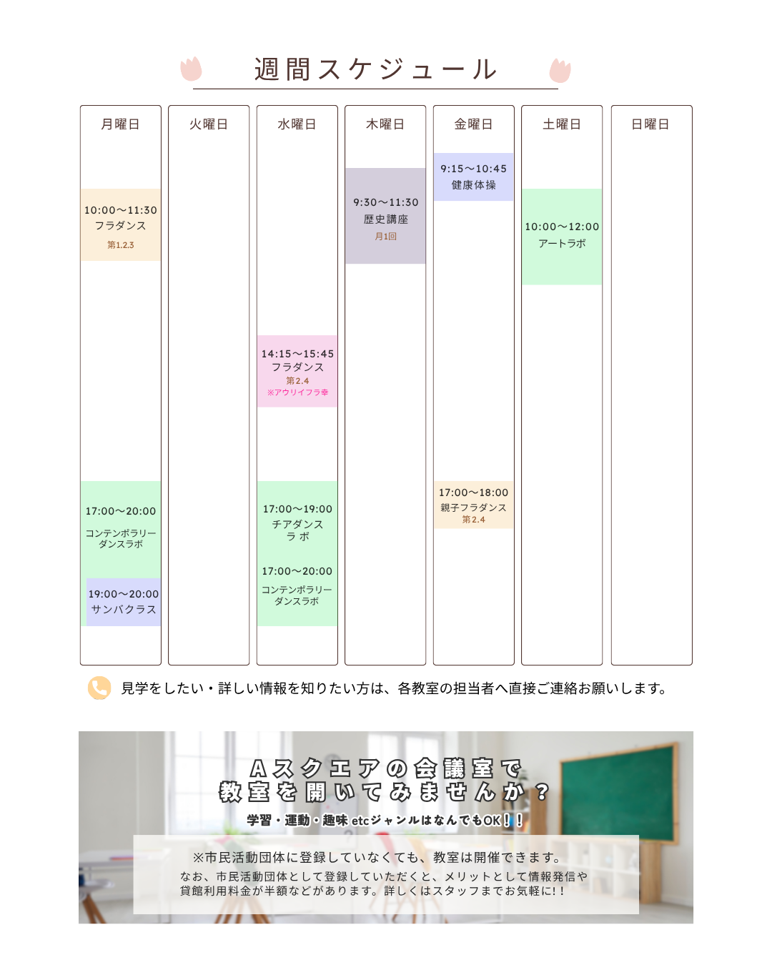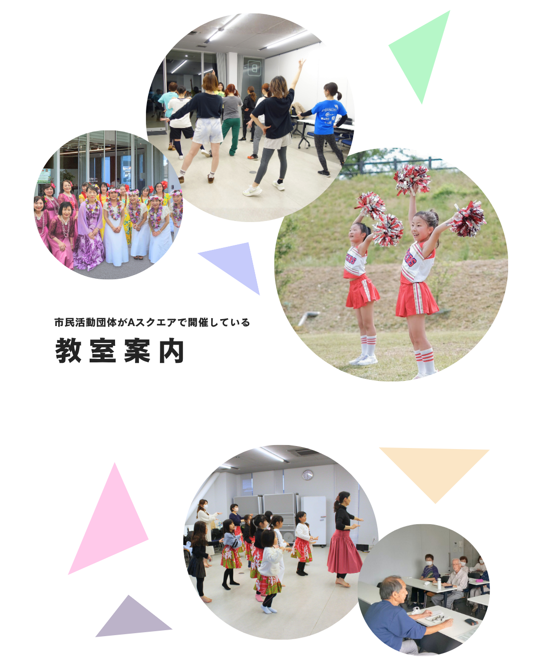 市民活動団体がAスクエアで開催している教室情報をまとめました。 この春から、新しい習い事にチャレンジしてみませんか?