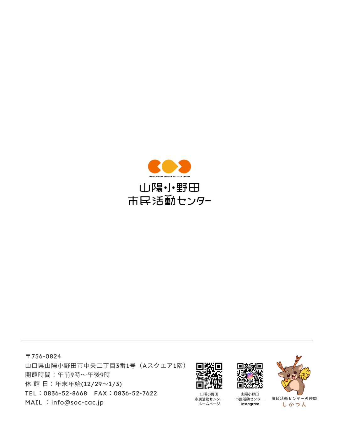 〒756-0824 山陽小野田市中央二丁目3番1号 (Aスクエア1階) TEL : 0836-52-8668 (月曜から金曜日の午前9時~午後5時) FAX : 0836-52-7622 MAIL:info@soc-cac.jp 開館時間 : 午前9時~午後9時 休館日 : (休館日 12月29日~1月3日) ※土日祝のお問い合わせは次営業日の対応となります