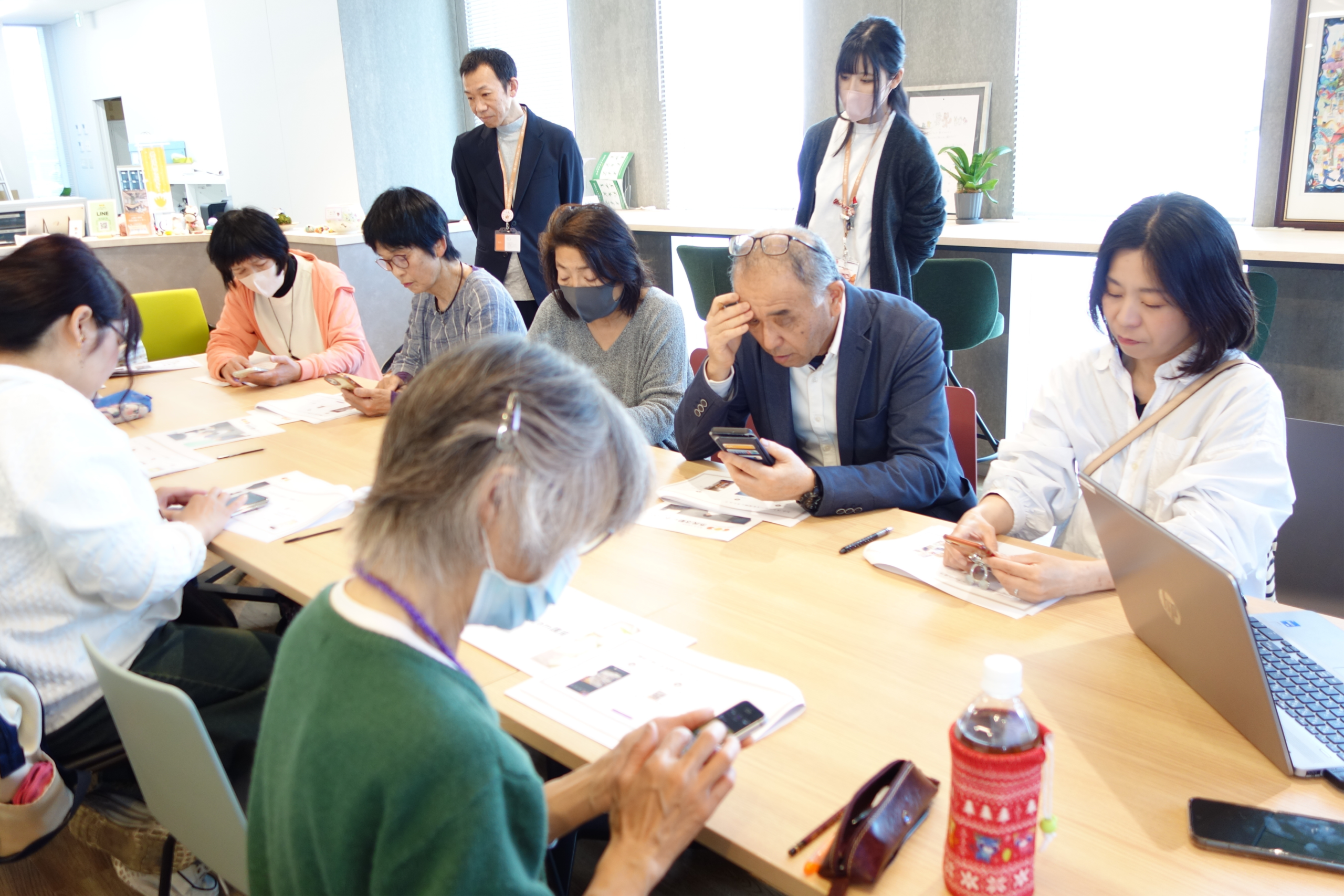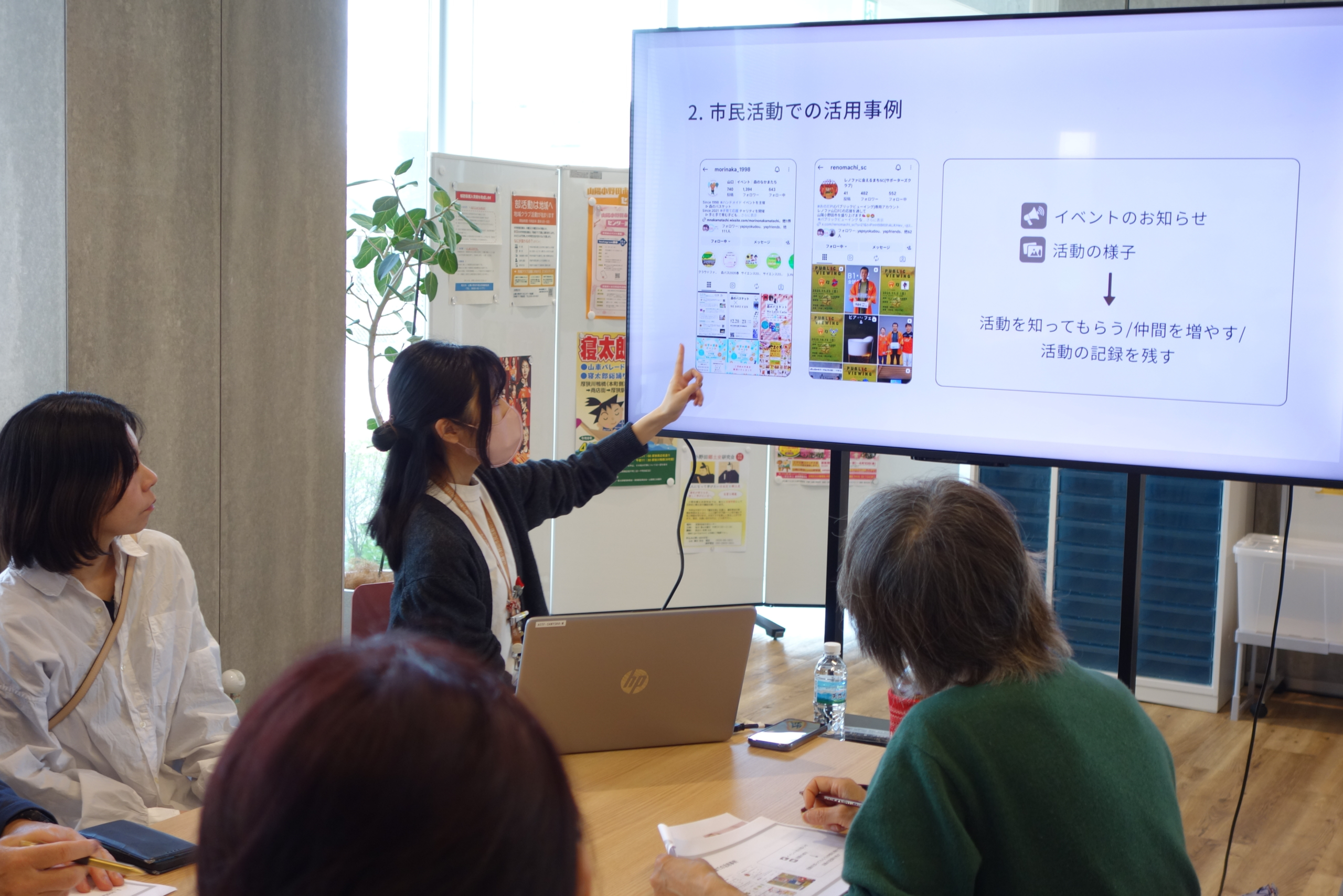 市民活動団体を含む10名の参加者が集まり、Instagramの基本操作の説明を聞いて、フィード投稿とストーリー投稿にチャレンジ。